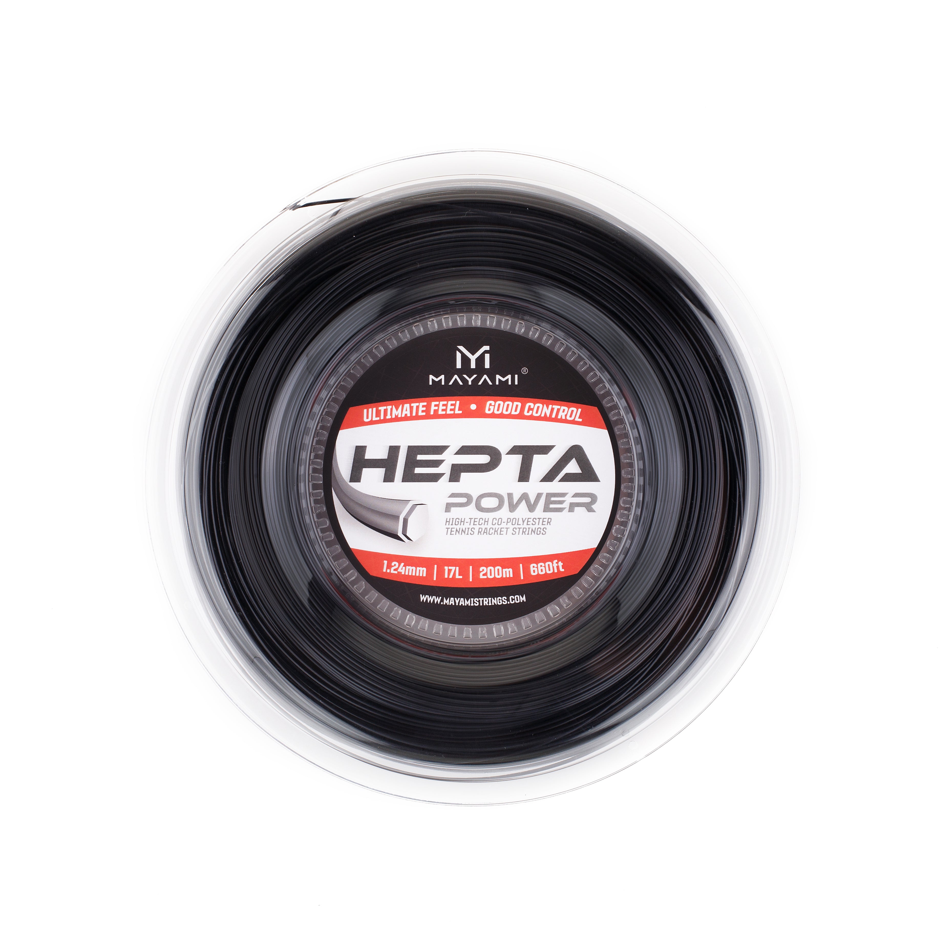 Mayami Hepta Power is a co-polyester string. Co-polyester suits competitive players who prioritize control and spin — its low-powered character rewards full, aggressive swings. See community reviews for individual player feedback.