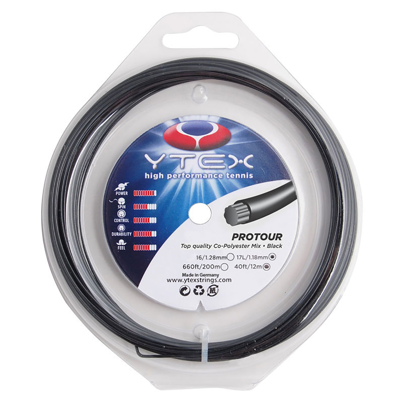 Ytex Protour is a co-polyester string. Co-polyester suits competitive players who prioritize control and spin — its low-powered character rewards full, aggressive swings. See community reviews for individual player feedback.